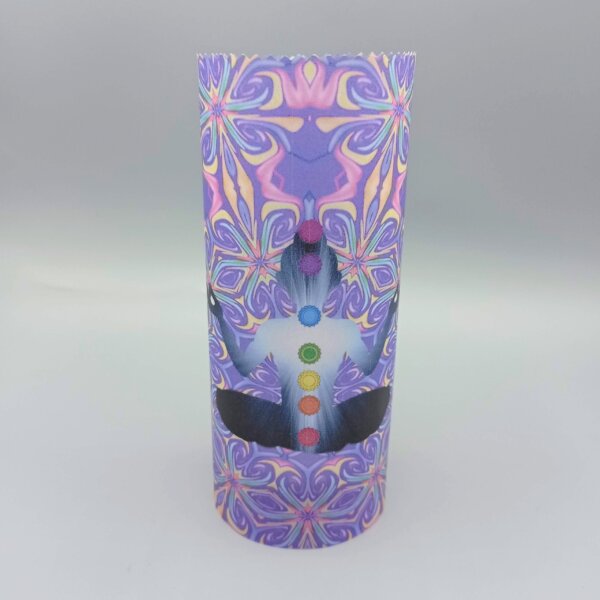 Se trata de una lámina de papel ignífugo, decorado con motivos de los chakras. Un color violeta para estimular la conexión con la energía y la  silueta de un cuerpo con los siete colores reflejados en cada uno de los canales energéticos. Cuenta de con sólido portavelas de cristal, y la velita que está incluida. Y gracias al tamaño del portavelas y su robustez, no solo podrás poner velitas, sino las velas que te apetezca, como el Velón Cho Ku Rei.