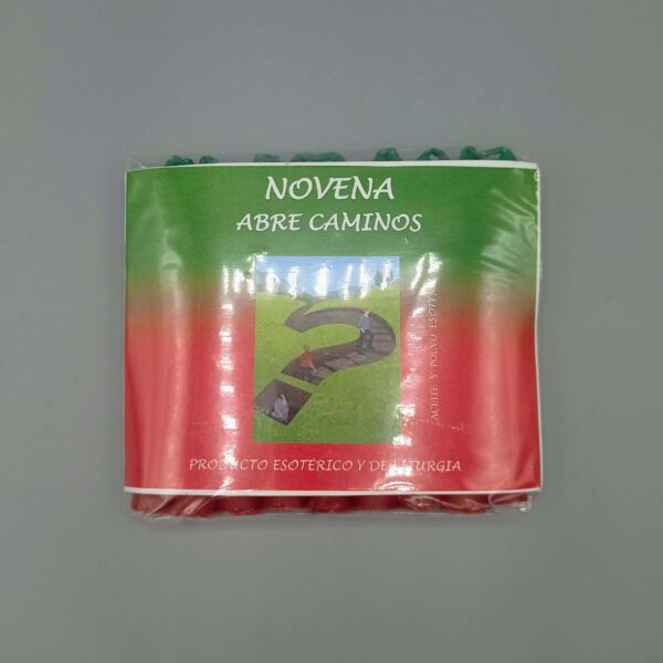 Se trata de un ritual que dura nueve días. Consta de nueve velitas y una pequeña cápsula con aceite para consagrar cada una de las velitas. Se trata de una especie de plan de choque, igual que el Velón Abrecaminos. Pero, en vez de durar dos o tres días seguidos, como suele durar, actuará por ráfagas cada día. Por eso, con cada velita que enciendas de esta novena, los caminos se irán despejando más y más, de forma continua.