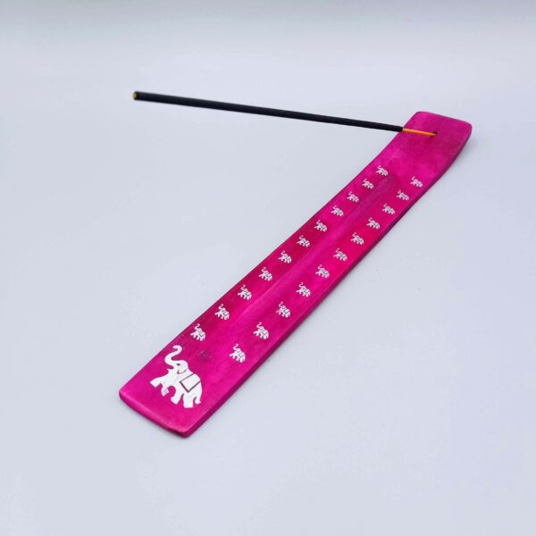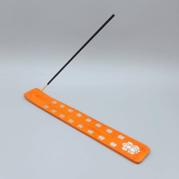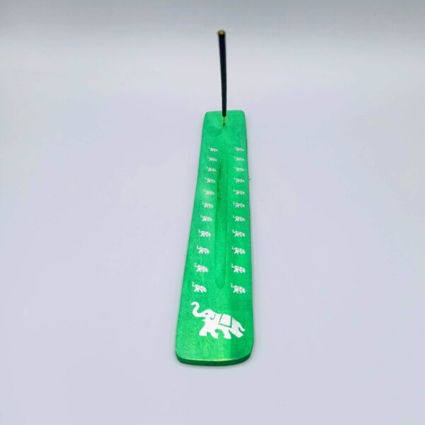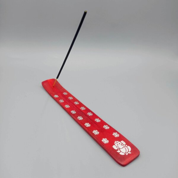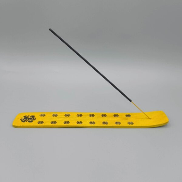 Se trata de una pieza de madera de 26 centímetros por 3.5 centímetros de ancho. Podrás obtenerlos en colores rosa, naranja, amarillo, verde y rojo. Uno de los extremos, está más elevado y cuanta con un orificio de apenas un par de milímetros de diámetro. Allí mismo, puedes colocar tus varillas de incienso para cuando quieras poner una y además, dejar que se queme de forma segura. Porque si es alargado, es para que vaya recogiendo la ceniza de la varilla, mientras se quema.