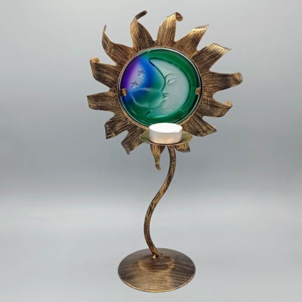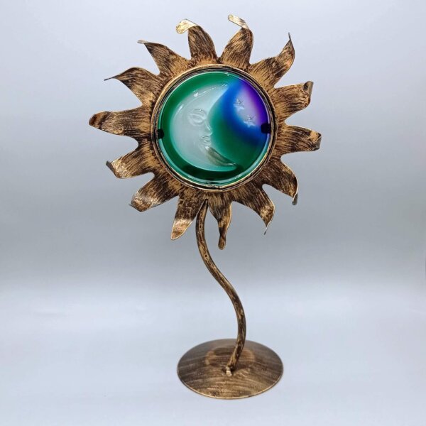 Es una estructura metálica forjada de forma artesanal. Mide 24 centímetros de alto y su exterior se abre como los pétalos de un girasol, pero el interior, cuenta con un hermoso cristal con una luna grabada y en tonos sutiles que se entremezclan. En la parte posterior, cuenta con un hueco para que puedas apoyar lo que necesites.